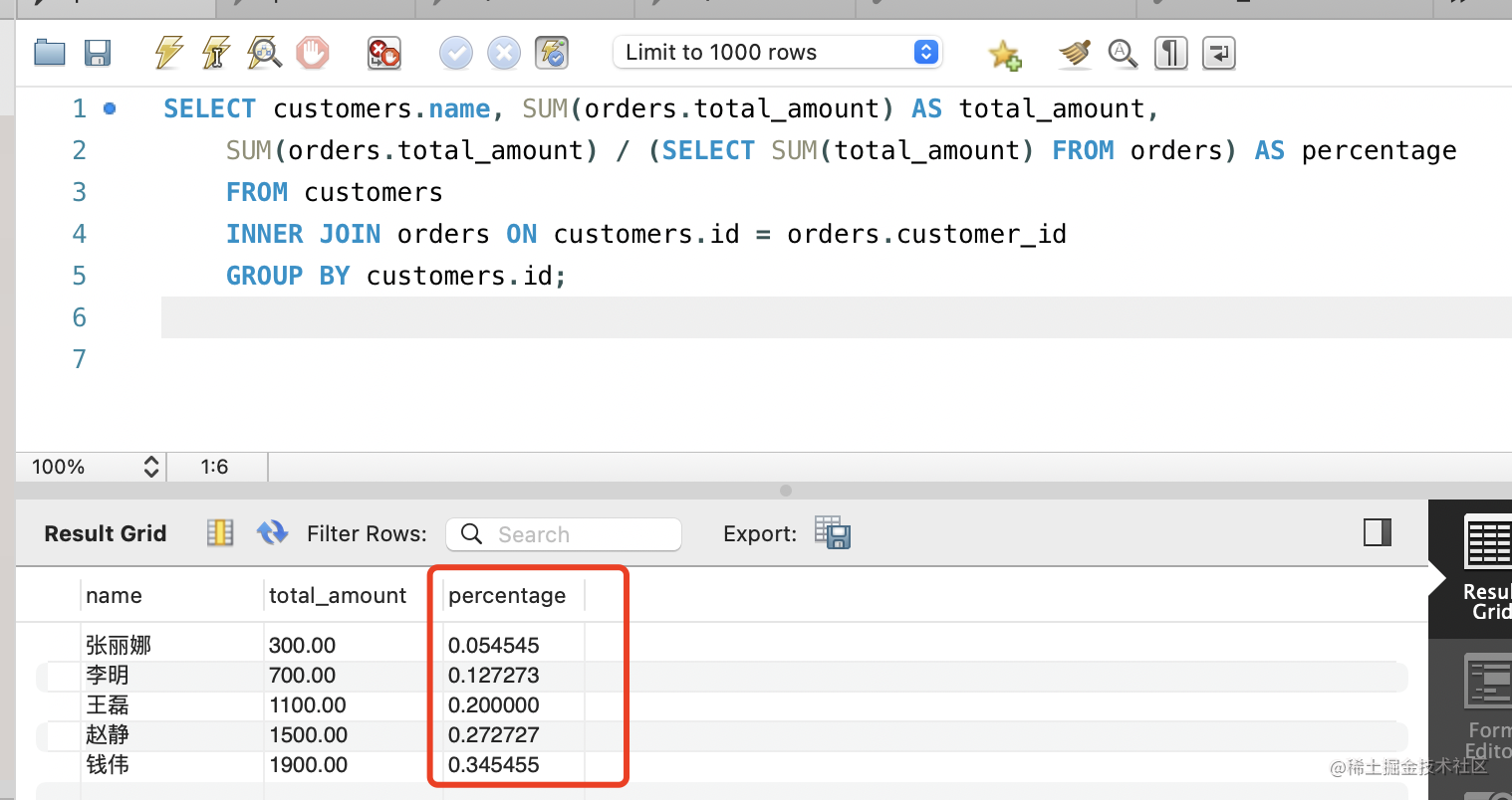 每个客户的总金额的需求上面实现了,这里需要算占比,就需要通过一个子查询来计算全部订单的总金额,然后相除: