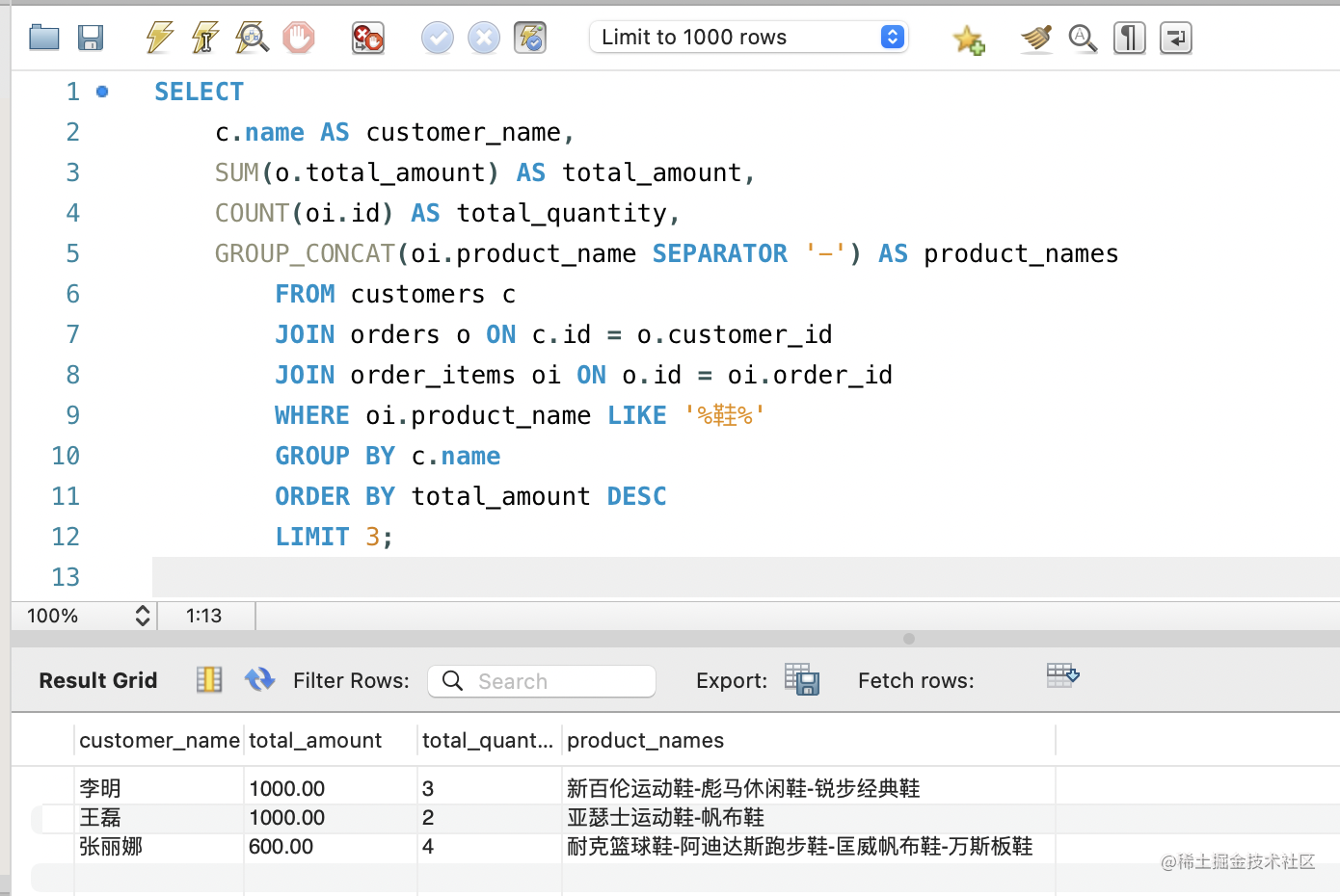 需求 6:查询每个客户的订单总金额,并计算商品数量,只包含商品名称包含“鞋”的商品,商品名用-连接,显示前 3 条记录:#