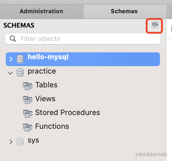 点击刷新,就可以看到这个 database(也叫 schema)了: