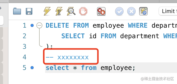 上面还涉及到注释的语法,sql 里的注释用 – 开头: