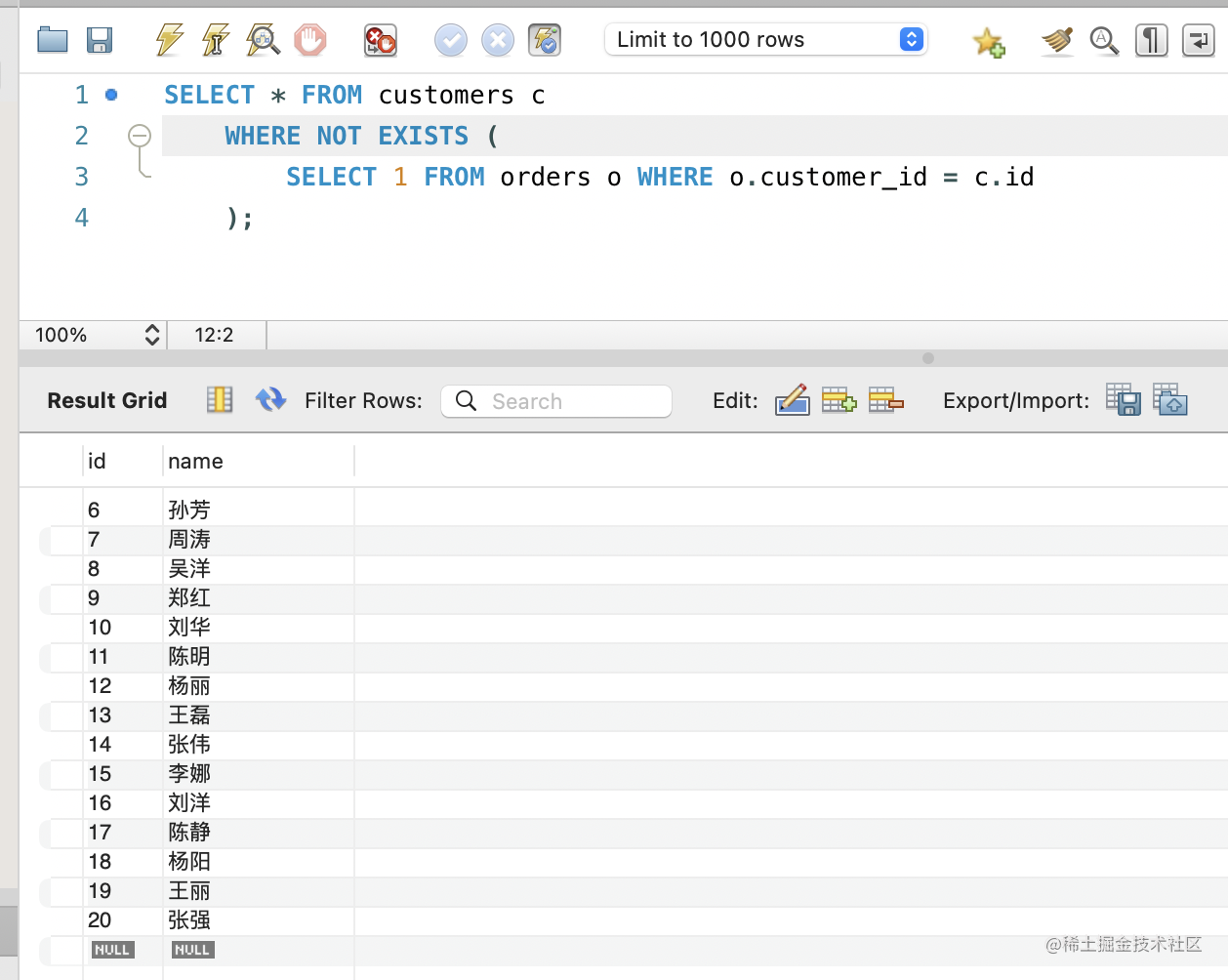 当然,你也可以用 NO EXISTS 来查询没有下单过的客户: