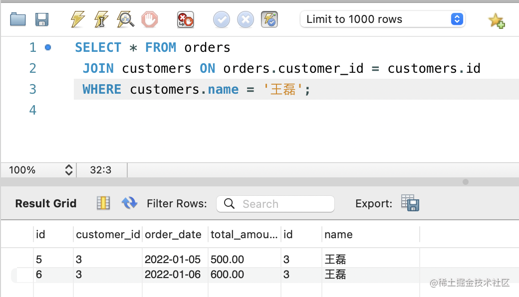 WHERE customers.name = '王磊';
