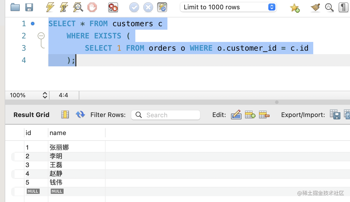 );如果从 orders 表中查出了当前 customer 的订单记录,EXISTS 就成立。