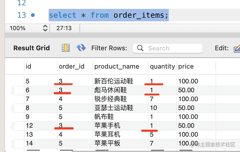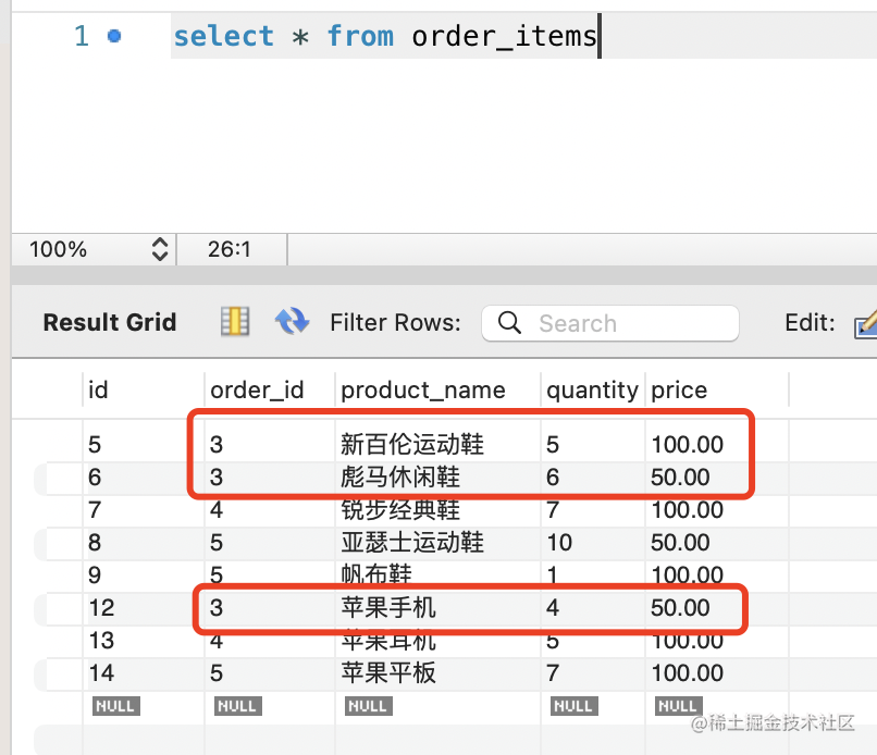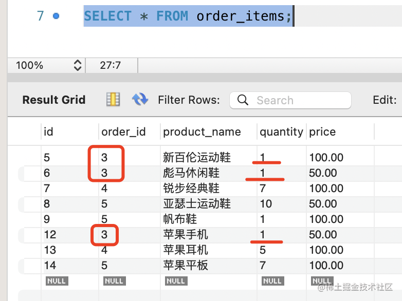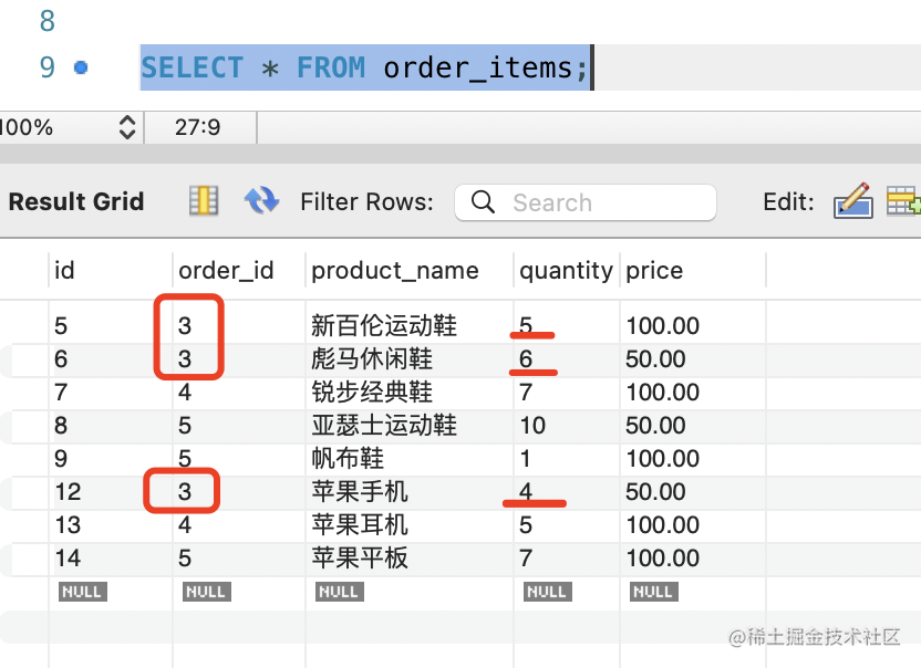 然后再查询下现在 orders 表和 order_items 表的数据。