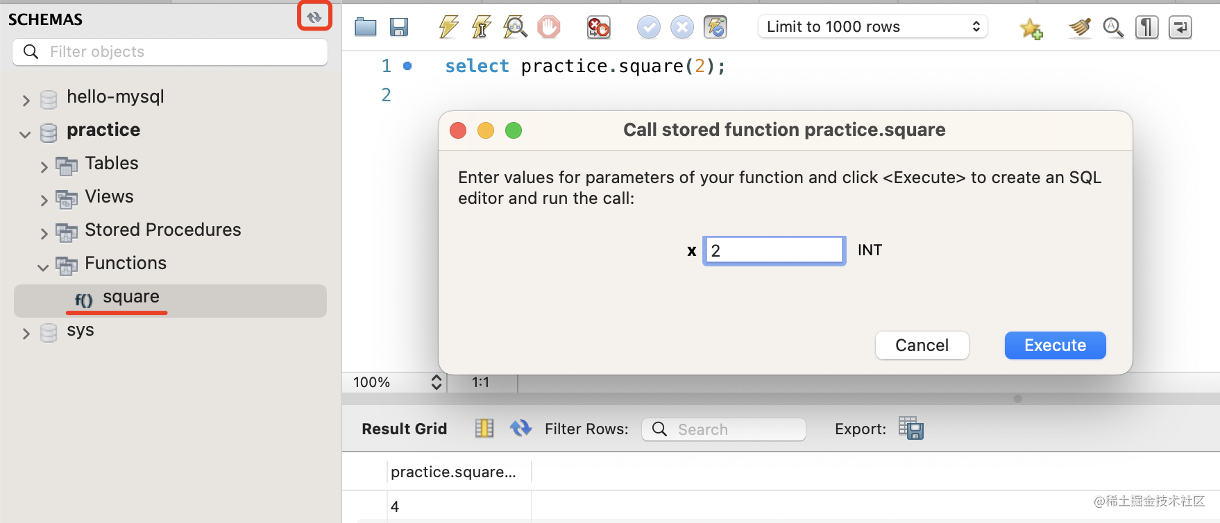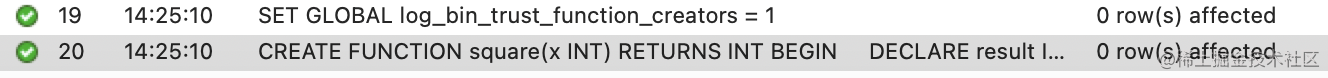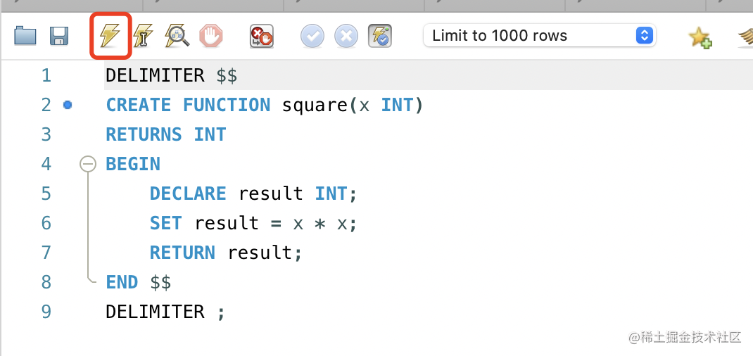 先 DECLARE 一个 INT 类型的变量,然后 SET 它的值为 x * x,之后通过 RETURN 返回这个结果。