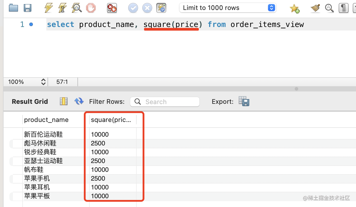 比如创建这个视图的 price 的平方: