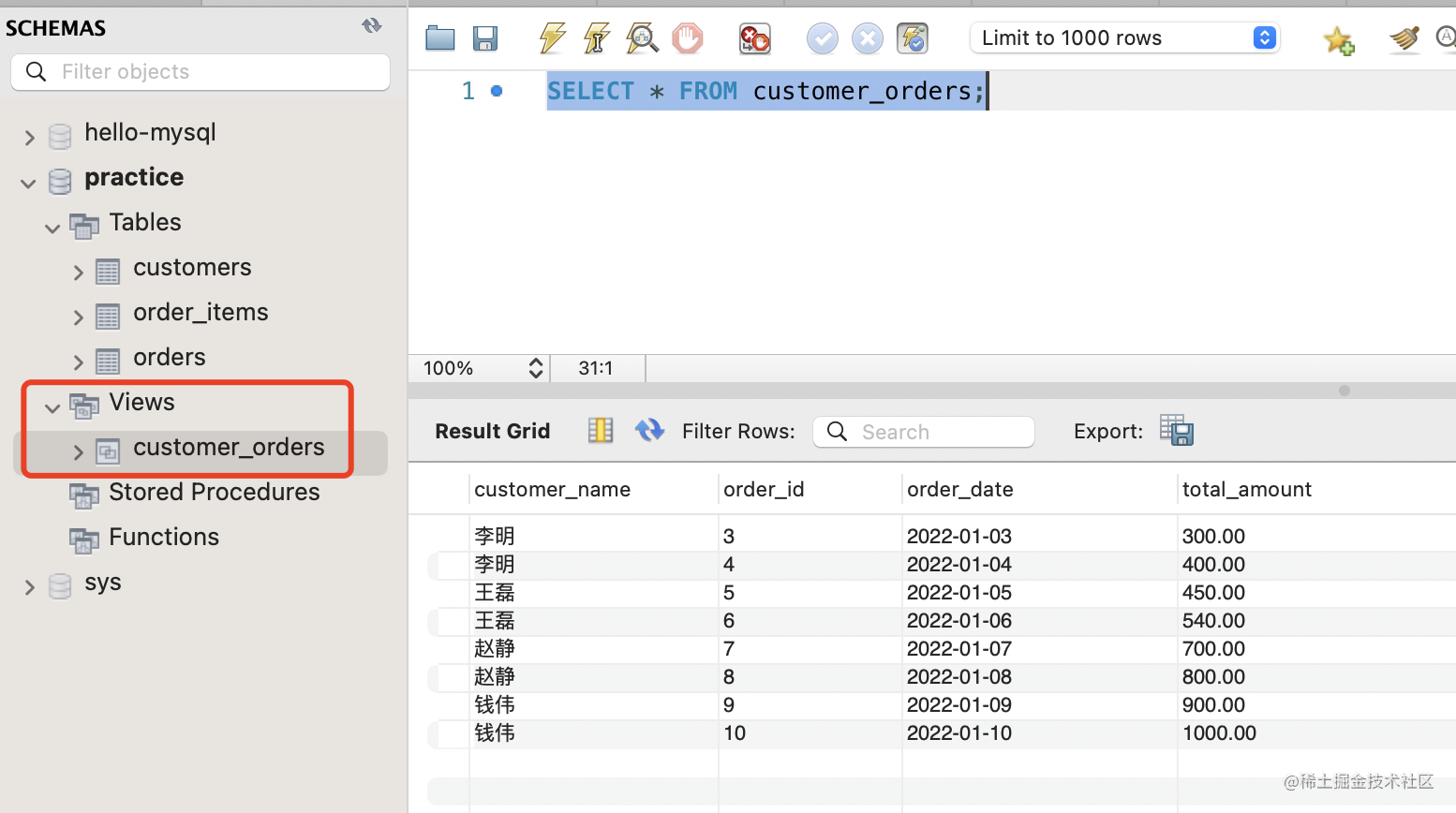 用之前的 customers、orders 表来建立视图: