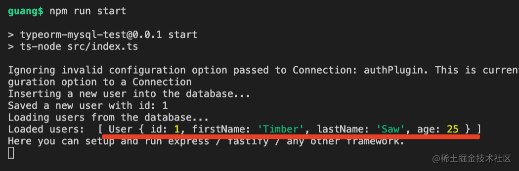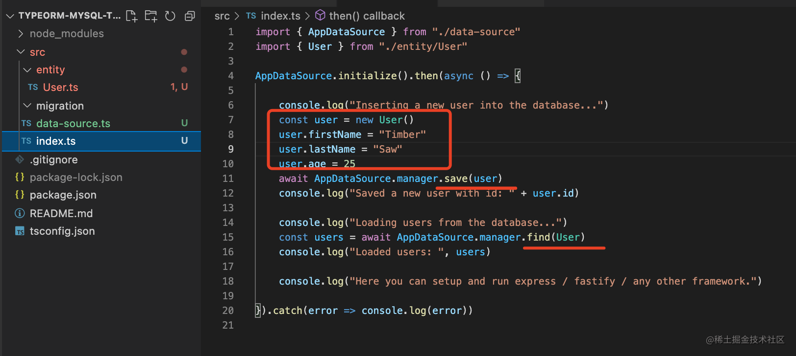 在 index.ts 里创建了一个 User 的对象,调用 save 方法保存这个对象,通过 find 方法查询这个对象: