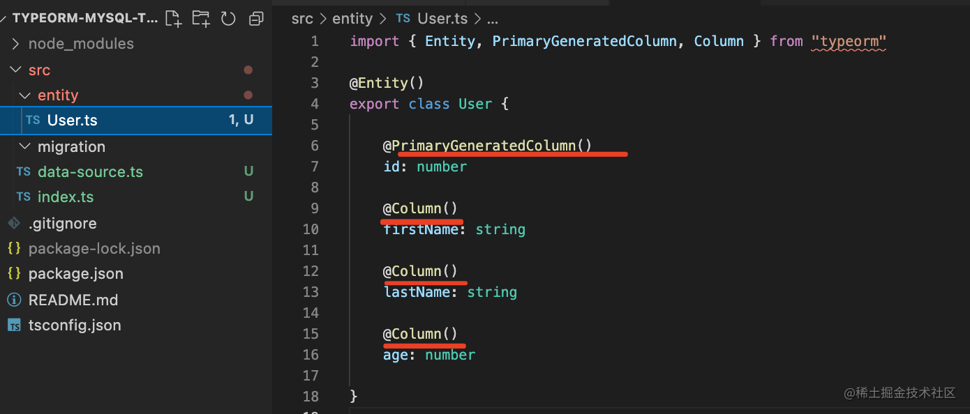 我们看下代码,有这样一个 entity,通过装饰器声明了主键列和其他的列: