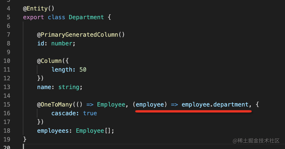一对多的 department 那方,不维护外键,所以需要第二个参数来指定通过哪个外键找到 department: