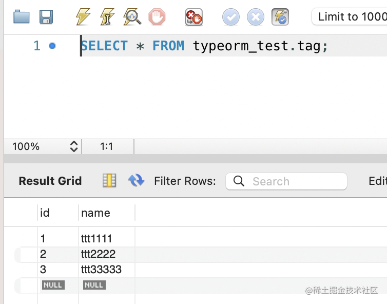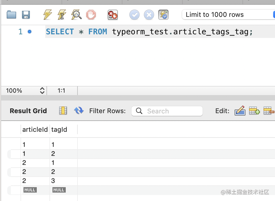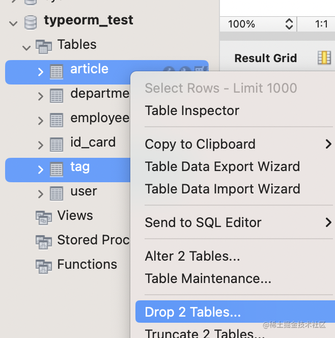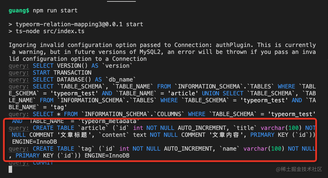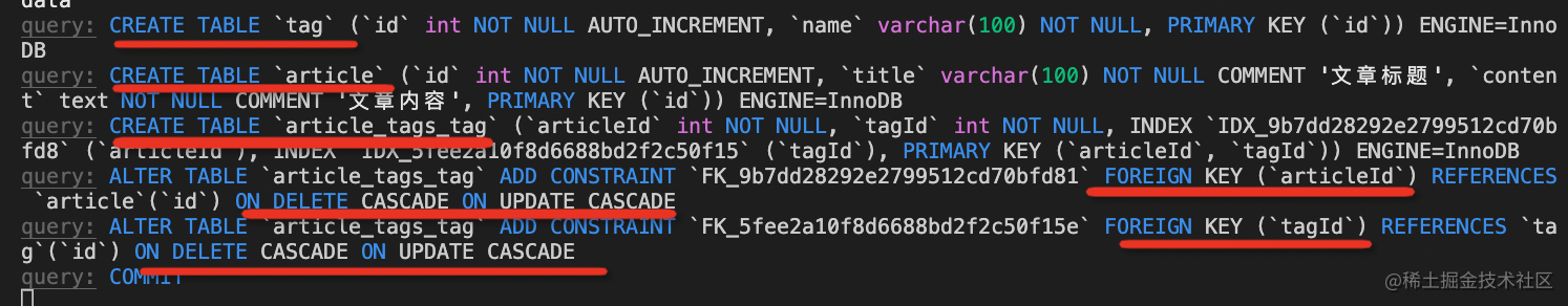 你会看到 3 条建表 sql,分别是 article、tag 和中间表 article_tags_tag