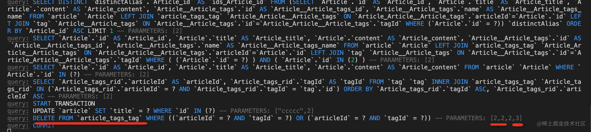 然后会把他和 id 为 2 的 article 的关系,(2, 2) (2, 3) 从中间表中删除。