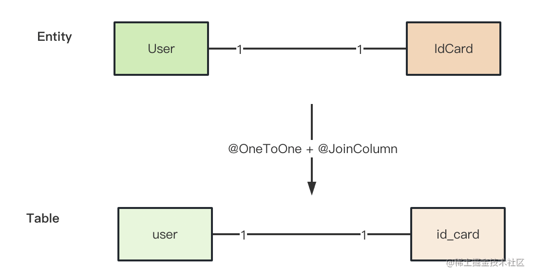 一对一我们是通过 @OneToOne 和 @JoinColumn 来把 Entity 映射成数据库表: