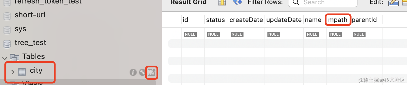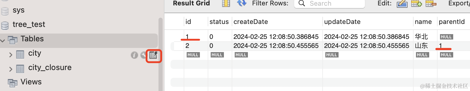 在 city 表里保存着 city 记录之间的父子关系,通过 parentId 关联。