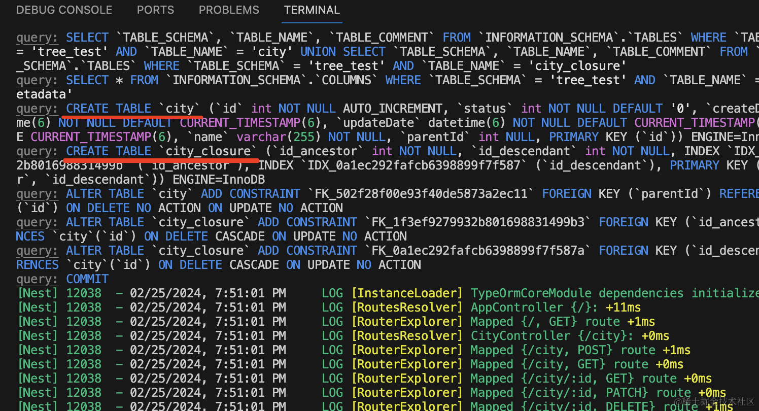 npm run start:dev可以看到,自动创建了 2 个表: