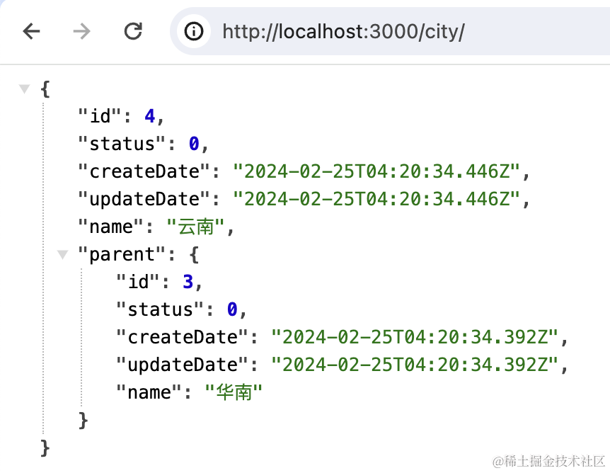 }这里创建了两个 city 的 entity,第二个的 parent 指定为第一个。