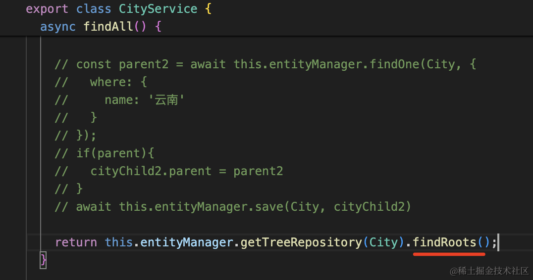 return this.entityManager.getTreeRepository(City).findRoots()