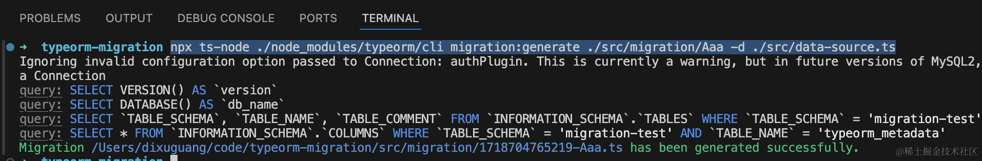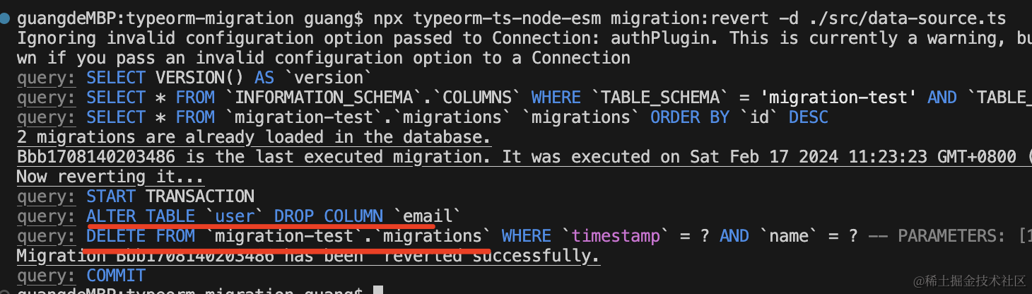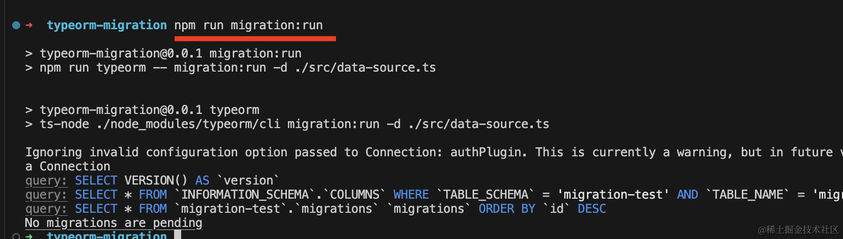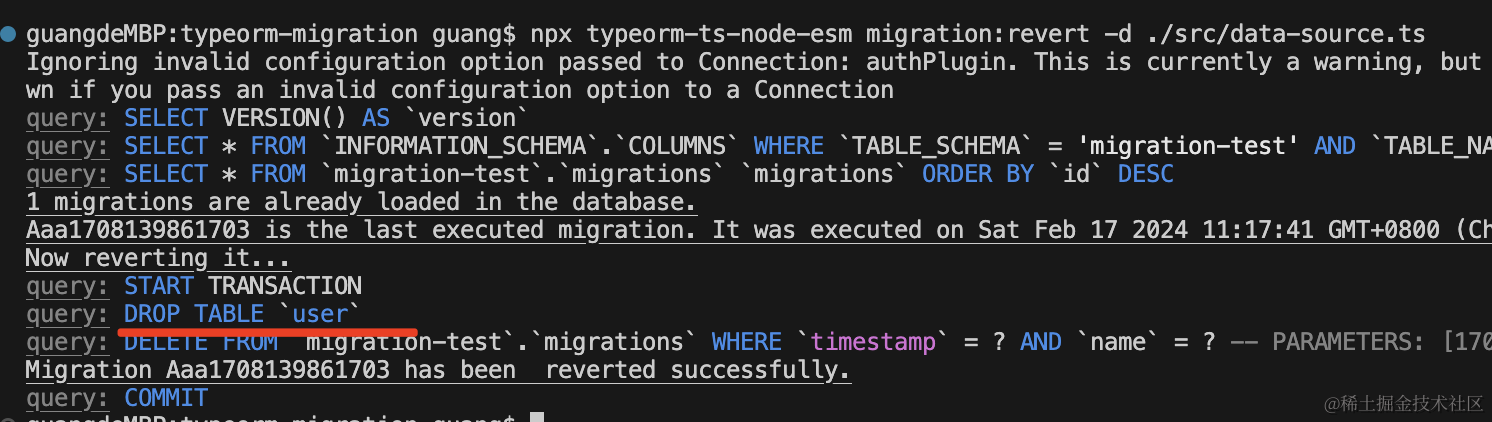 "migration:revert": "npm run typeorm -- migration:revert -d ./src/data-source.ts"这样用起来就简单多了: