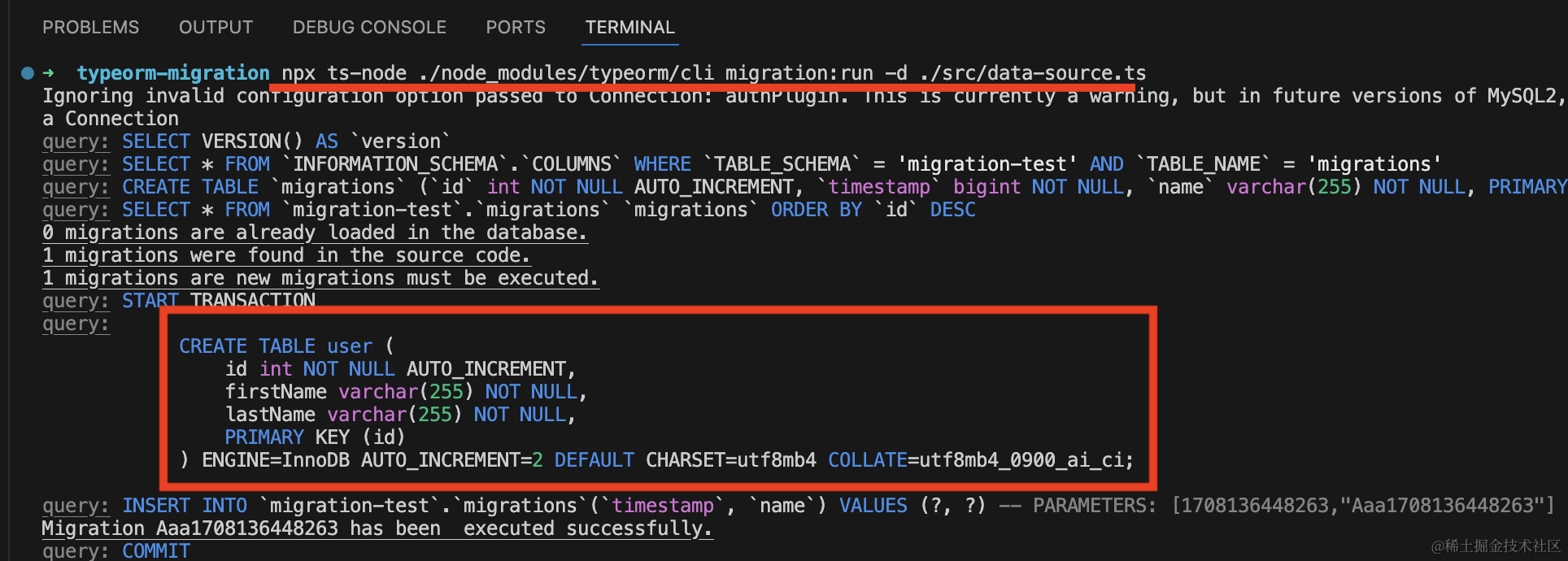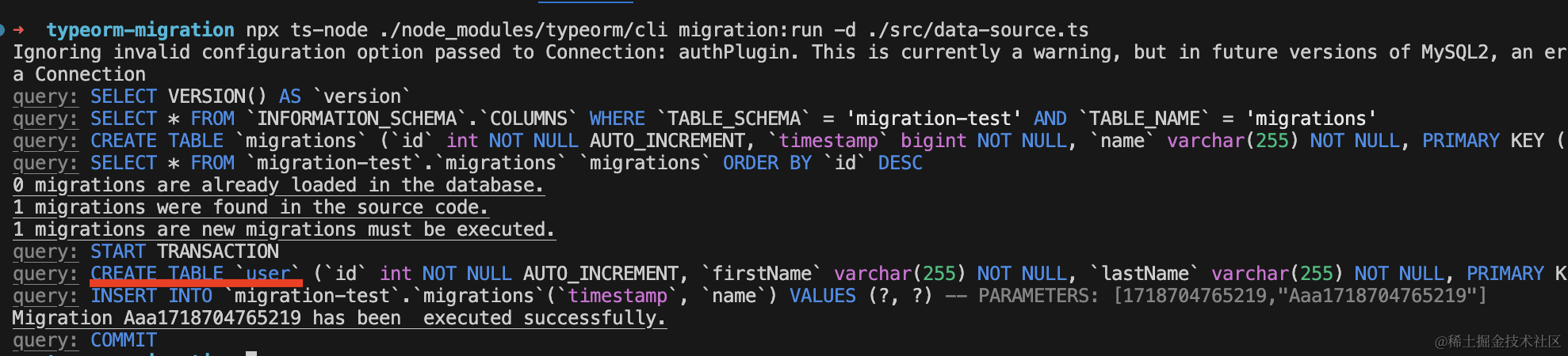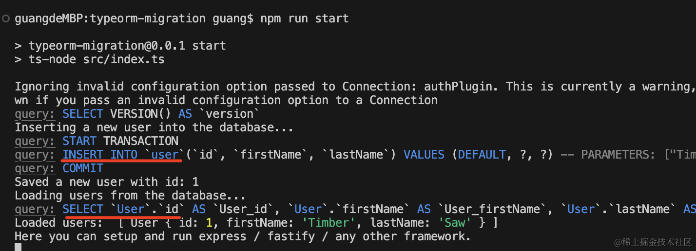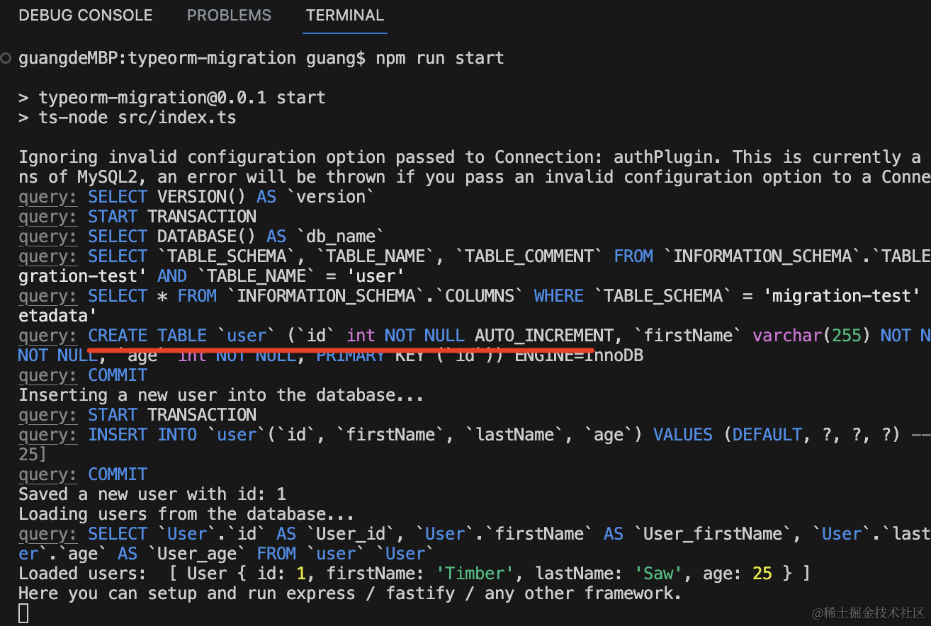 npm run start可以看到,会自动创建 Entity 对应的表: