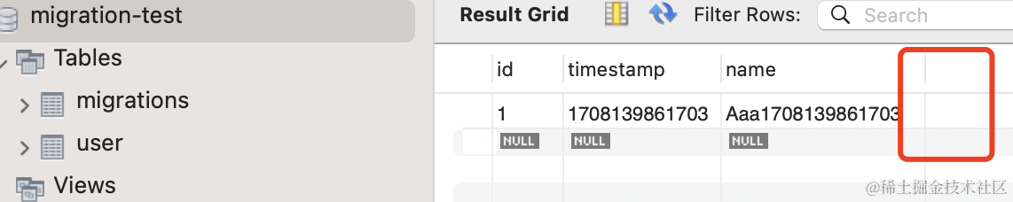 在 mysql workbench 里可以看到,之前的 age 列就没了: