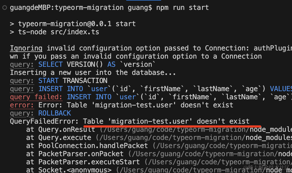 这时候因为 synchronize 关掉了,不会自动建表,所以 报错了: