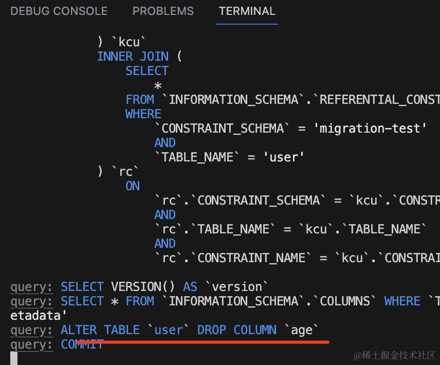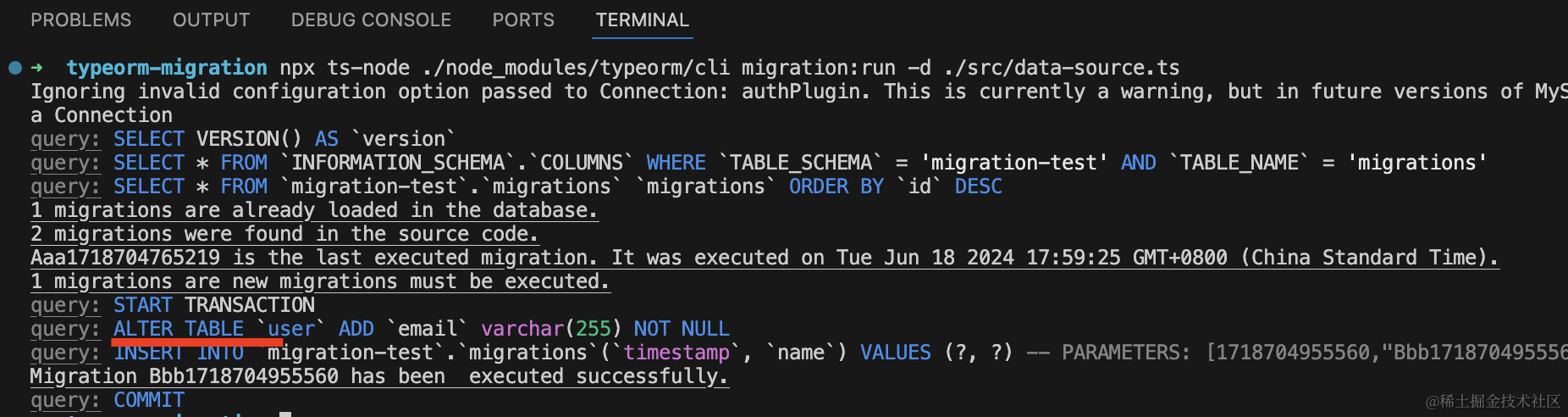 npm run start可以看到 TypeORM 检测到 Entity 的变更,修改了表结构: