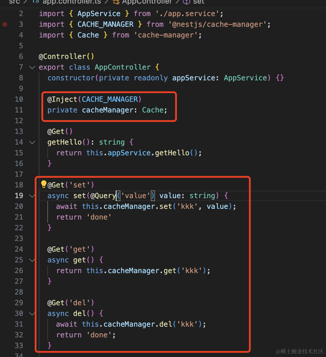 注入 CacheManager,分别测试下它的 get、set、del 方法。