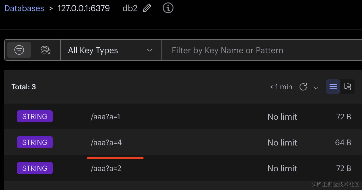 注意,连接的时候我们指定 database为 2,所以在 RedisInsight 里要切到 db2 才可以看到这些数据。