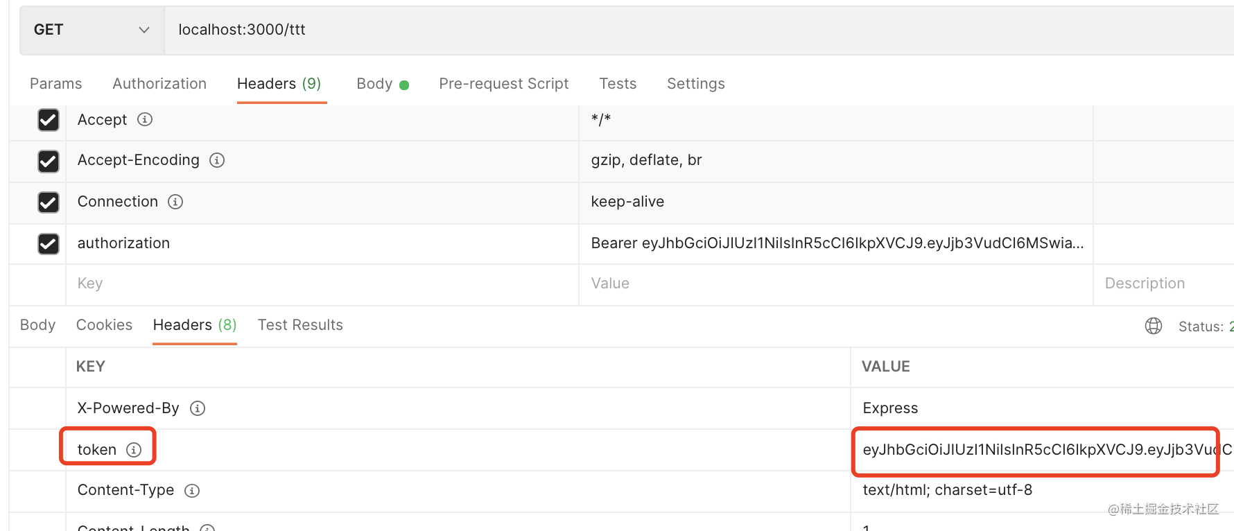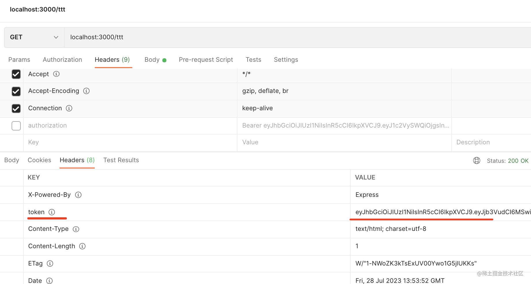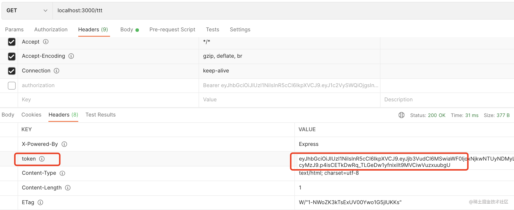 第一次访问,会返回 jwt token,把它复制下来: