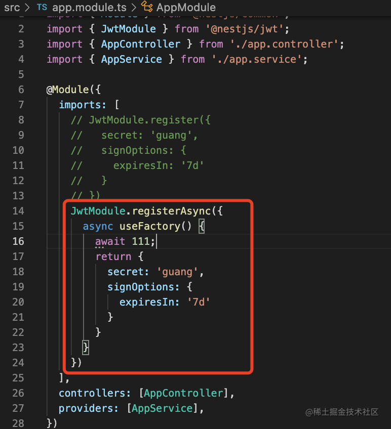 然后在 AppModule 里引入 JwtModule: