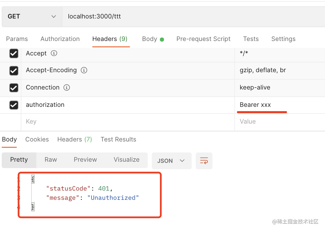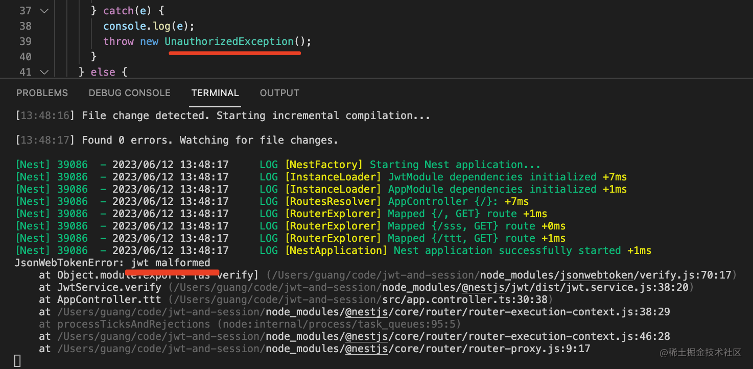 这时候 jwtService.verify 方法就会抛异常,然后我们返回了 401 错误。
