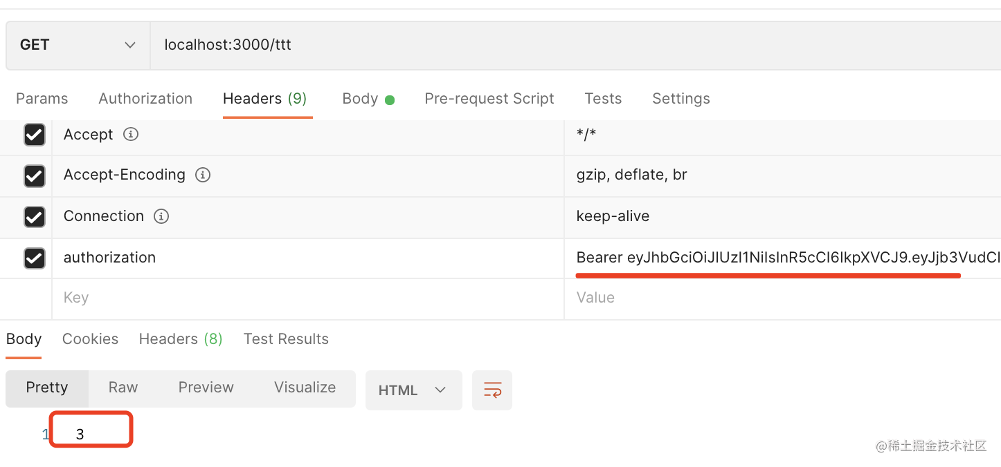 }通过 @Headers 装饰器取出 autorization 的 header,然后通过 jwtService.verify 对它做验证。