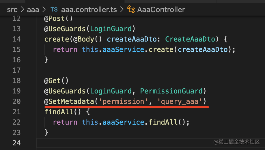 给 /aaa 接口声明需要 query_aaa 的 permission。
