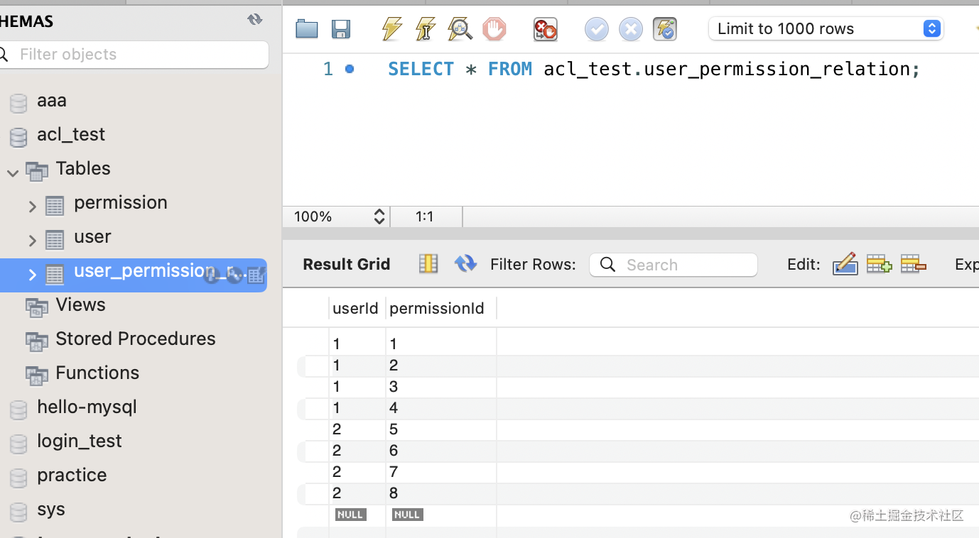 并且中间表 user_permission_relation 还有 userId、permissionId 两个外键。