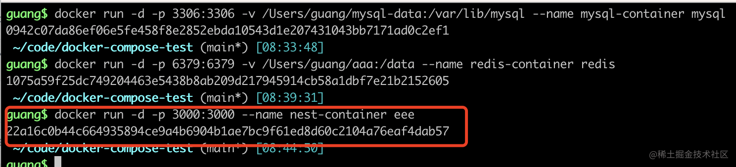 然后按顺序使用 docker run 来跑 mysql、redis、nest 容器。