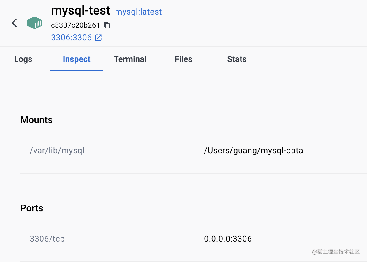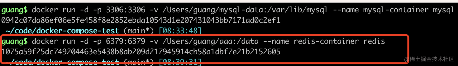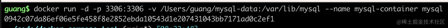 docker run -d -p 3306:3306 -v /Users/guang/mysql-data:/var/lib/mysql --name mysql-container mysql-d 是 deamon,放到后台运行的意思。
