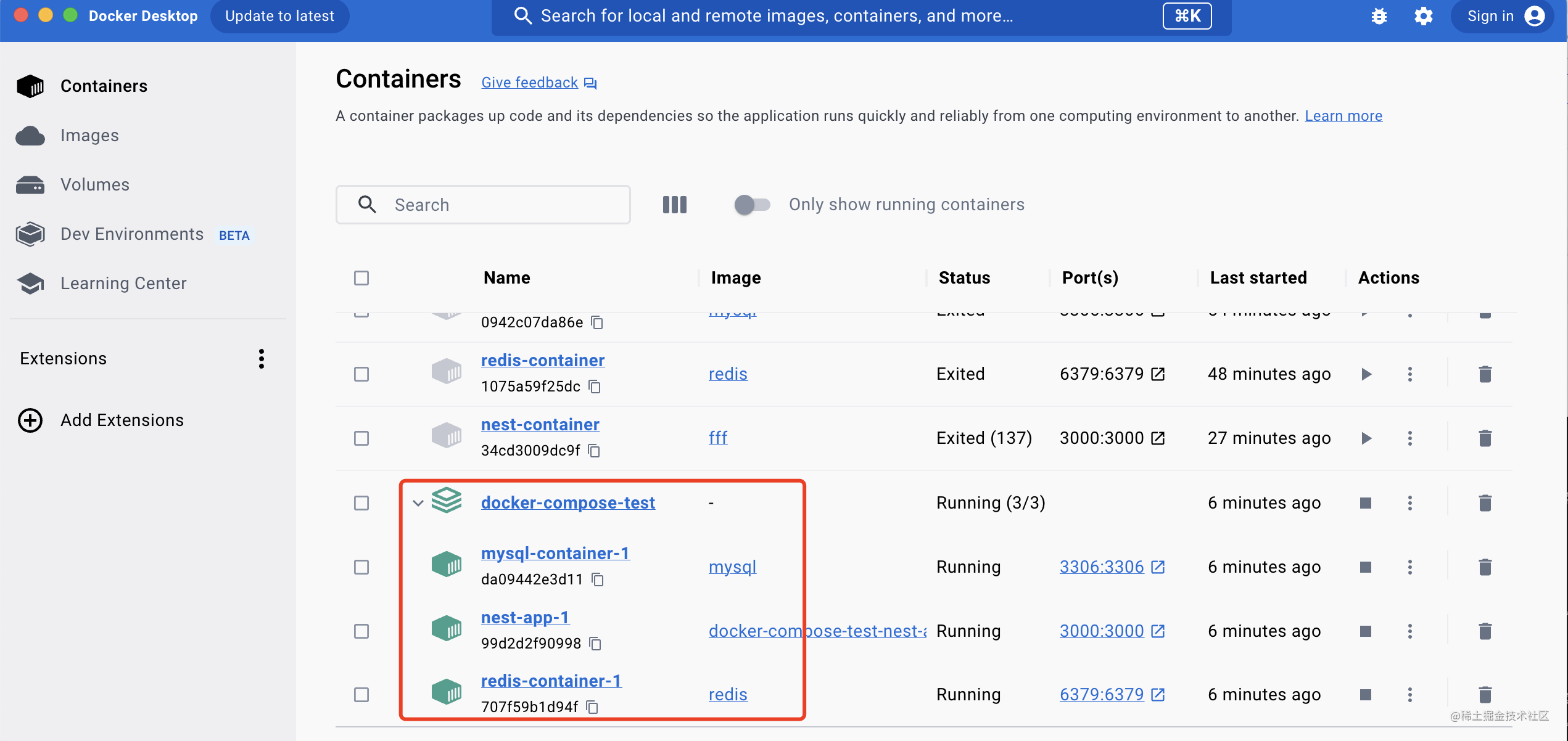 这样我们就把 mysql、redis、nest 3个 docker 容器跑了起来。