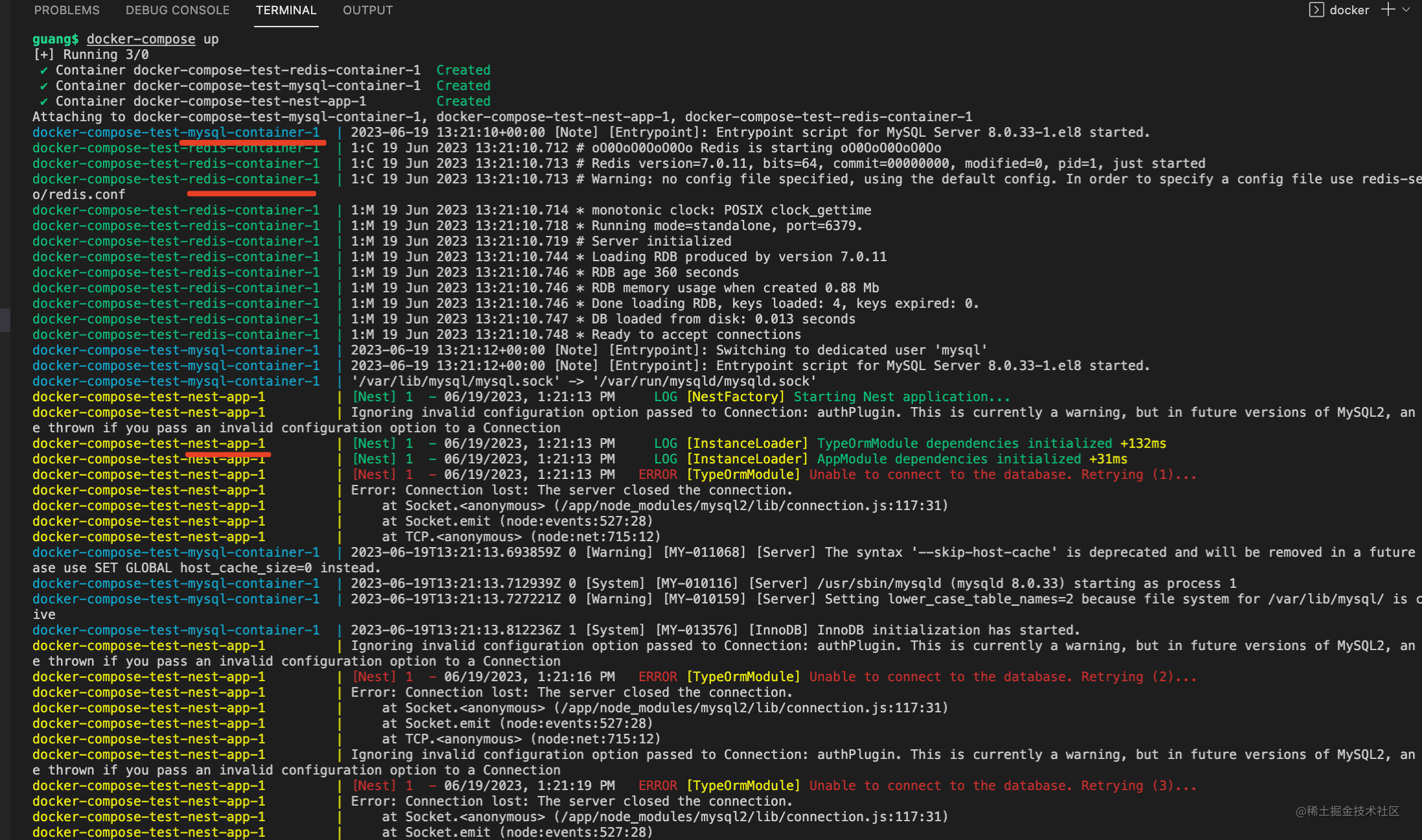 可以看到是先跑的 mysql、redis,再跑的 nest。
