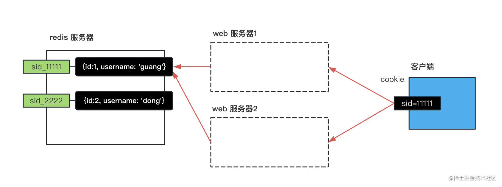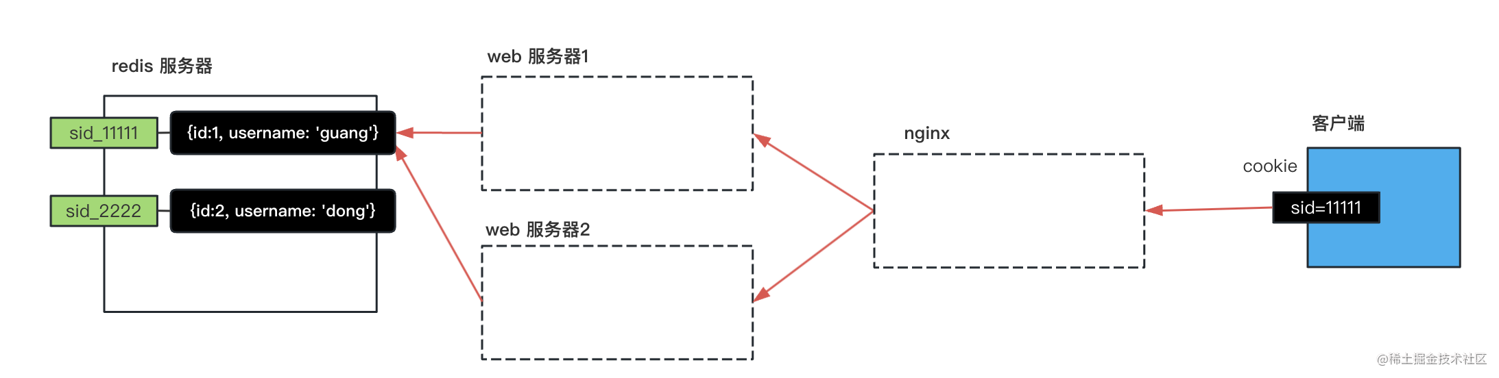 而现在基于 redis 存储的 session,不管请求到了哪台服务器,都能从 redis 中取出对应的 session 从而拿到登录状态、用户数据。