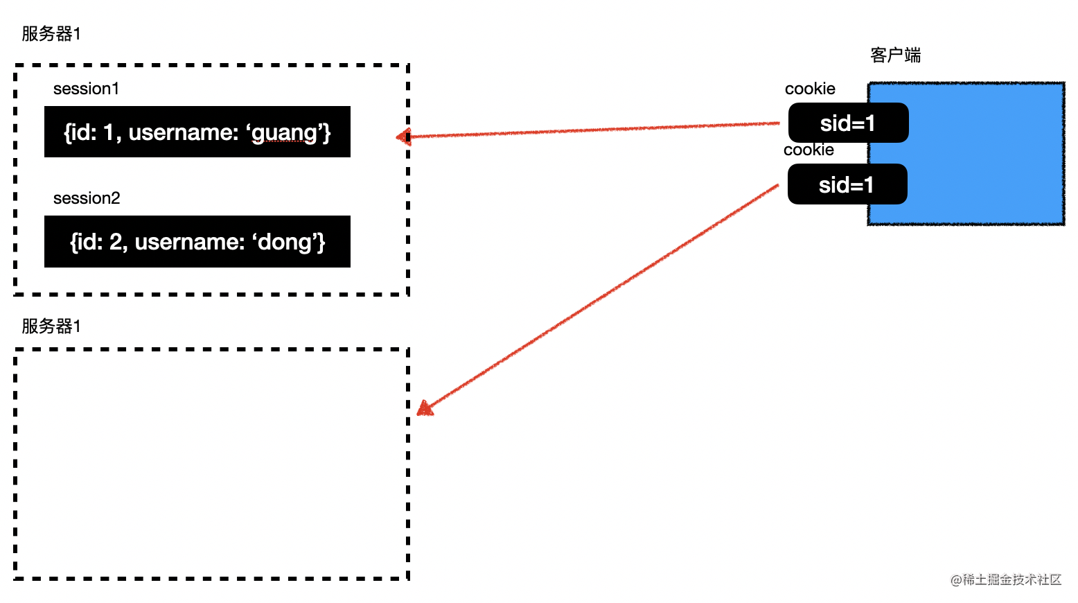 但是 session 的方式不行,它的数据是存在单台服务器的内存的,如果再请求另一台服务器就找不到对应的 session 了: