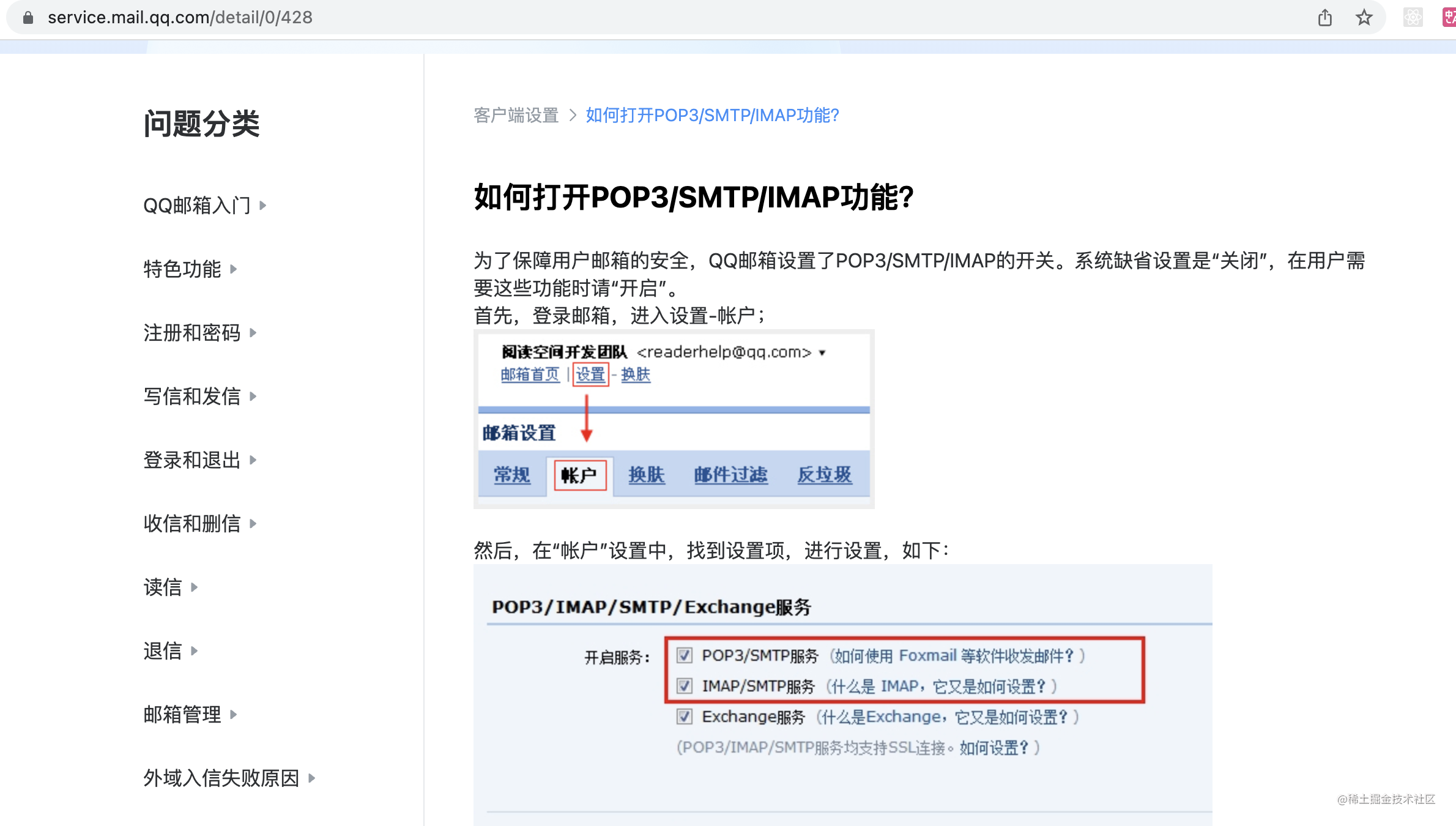 在邮箱帮助中心 https://service.mail.qq.com/ 可以搜到如何开启 smtp、imap 等服务: