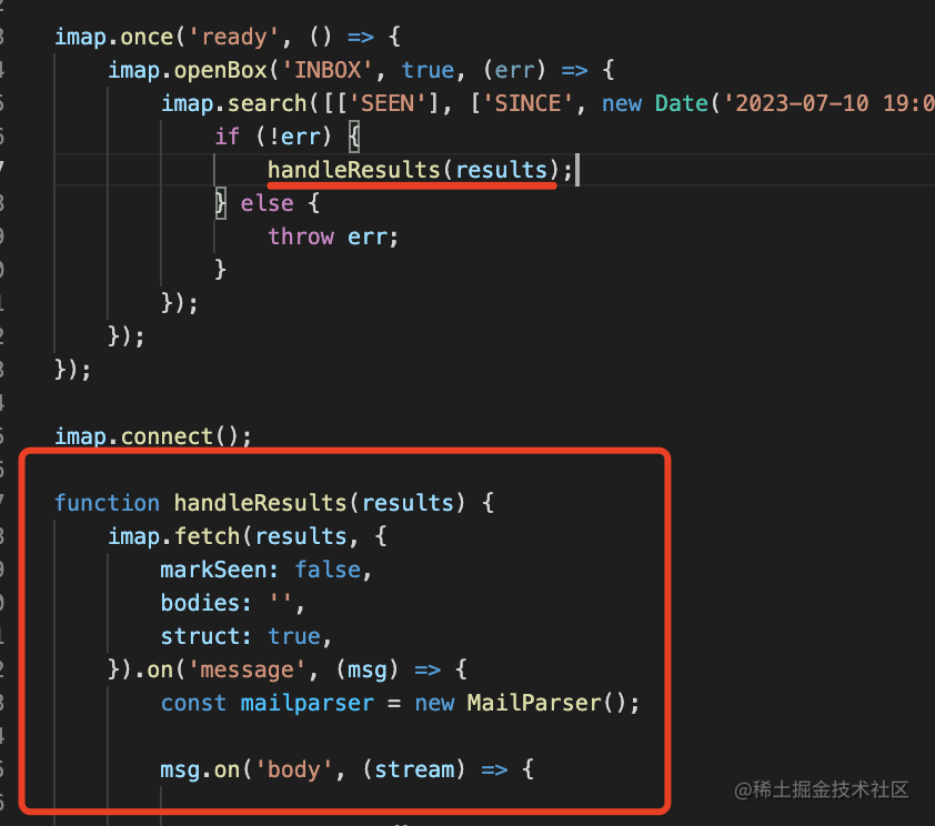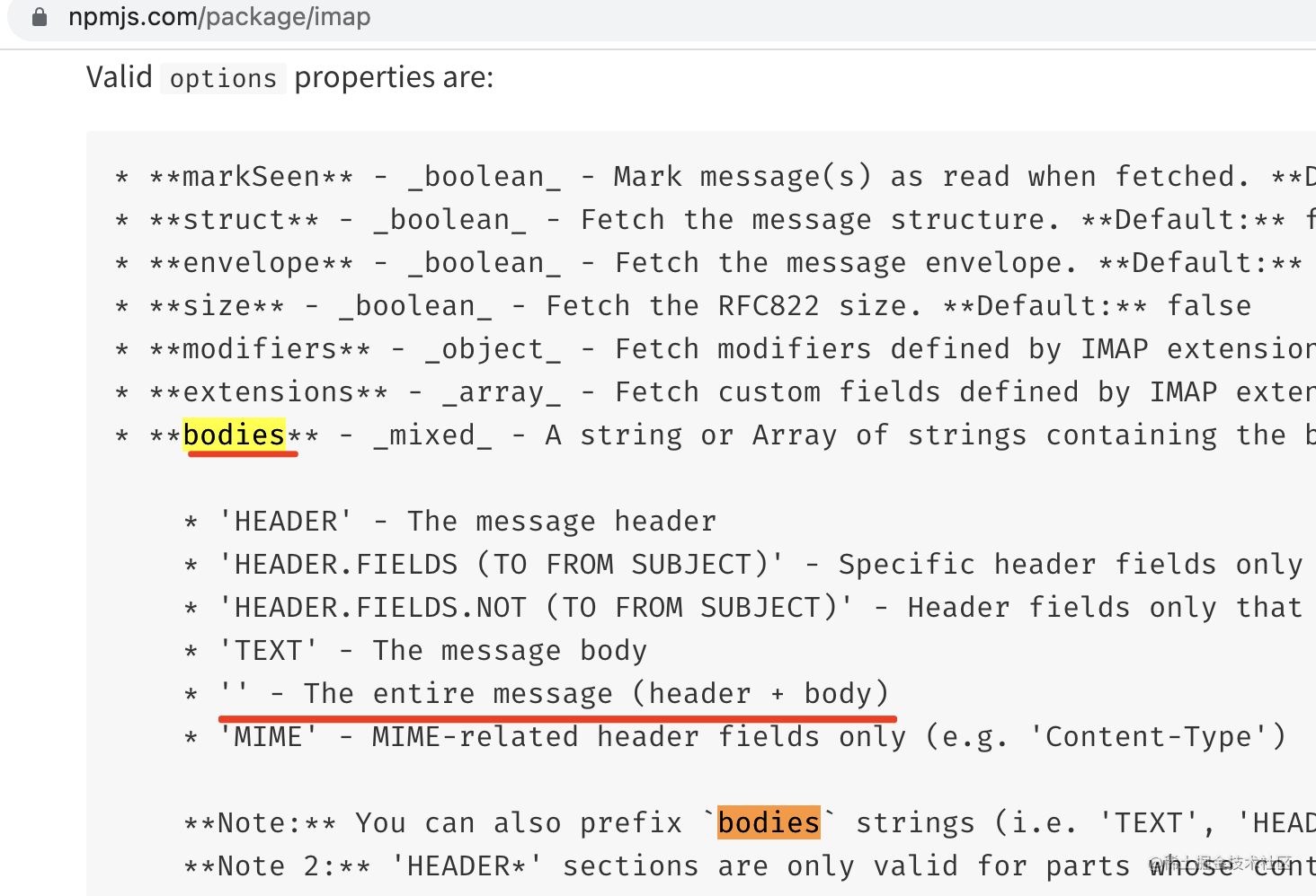 }这里用 imap.fetch 来请求这些 id 的内容,bodies 为 ’’ 是查询 header + body 的意思: