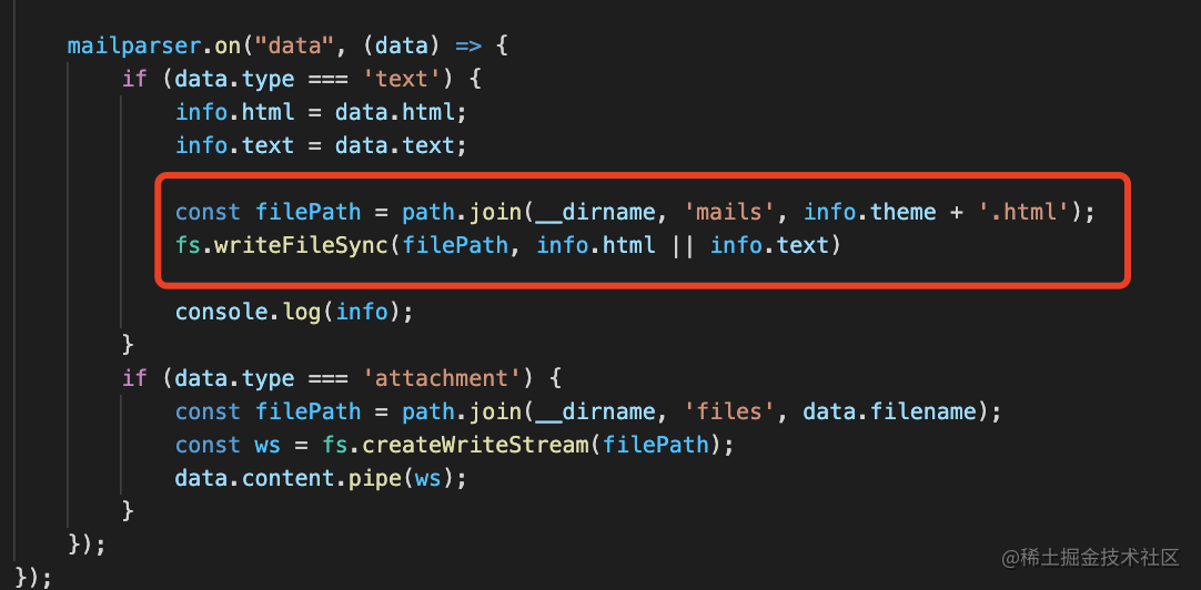 fs.writeFileSync(filePath, info.html || info.text)以邮件主题为文件名。