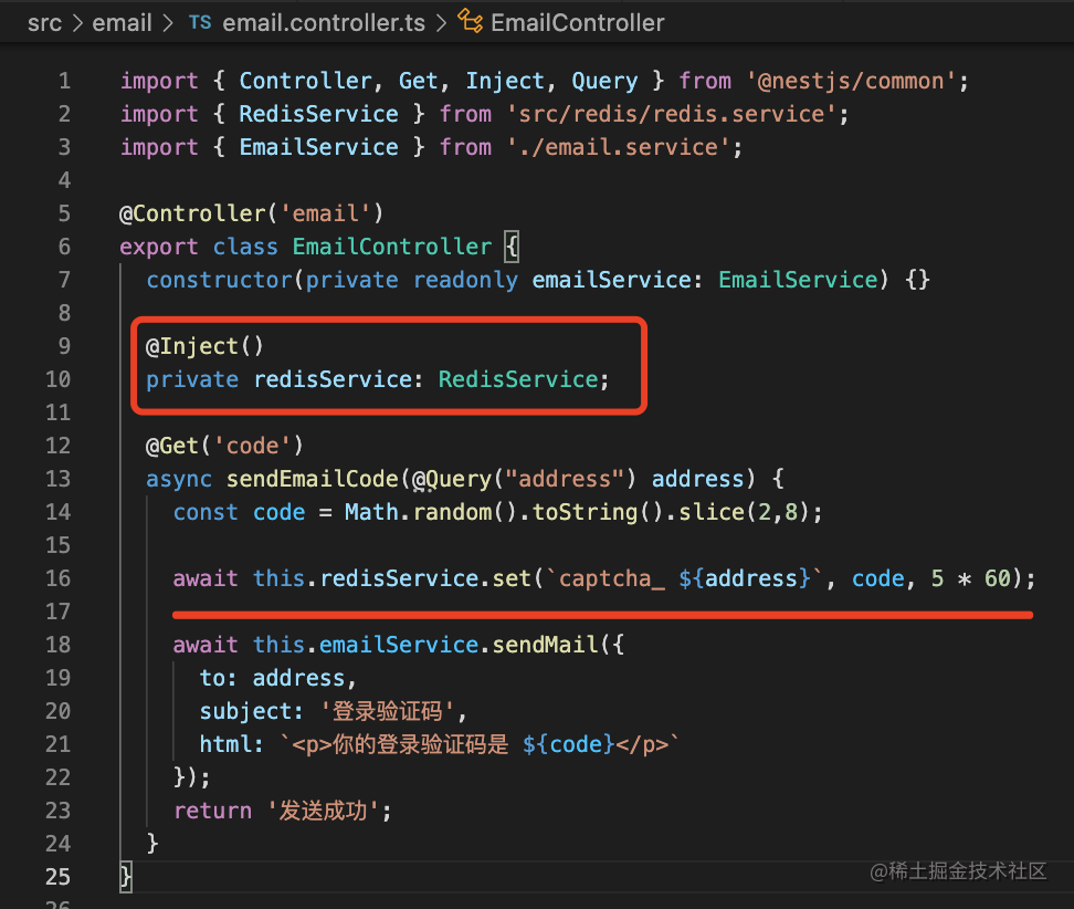 注入 RedisService,并且发送验证码之前把它存入 redis,key 为 captcha_邮箱地址。