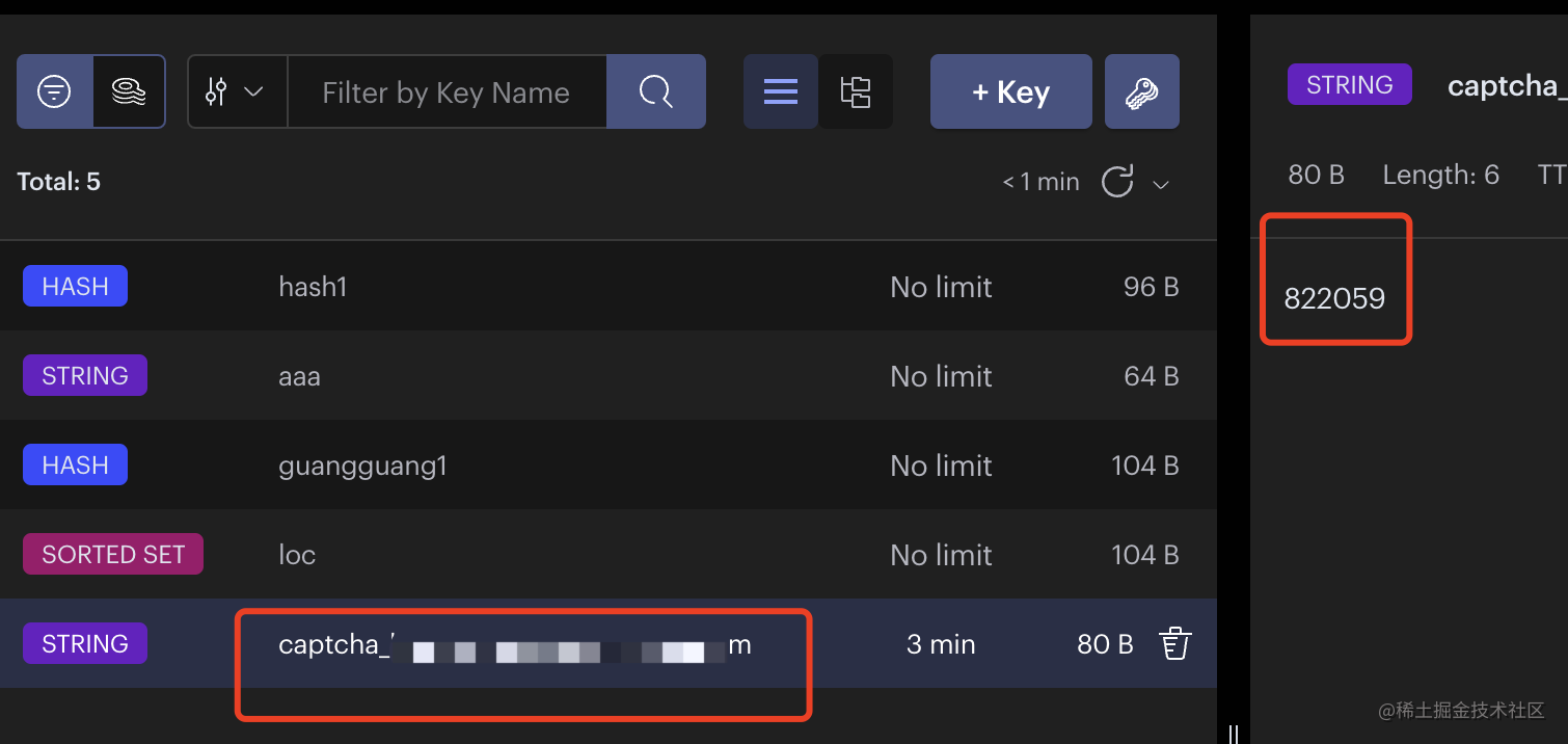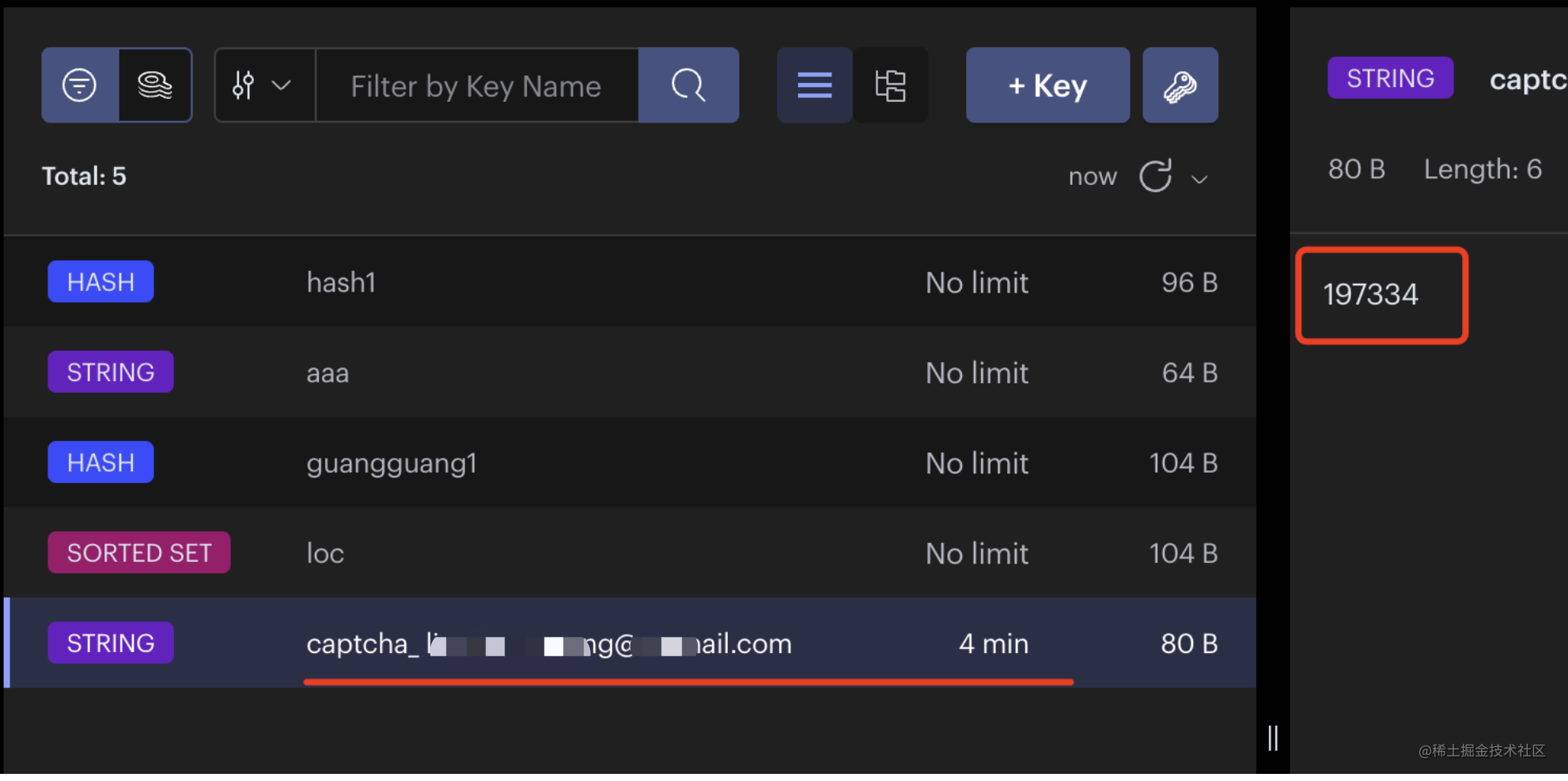 收到了验证码邮件,并且 redis 里也存了这个 key:
