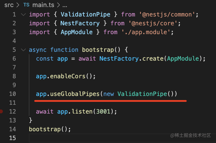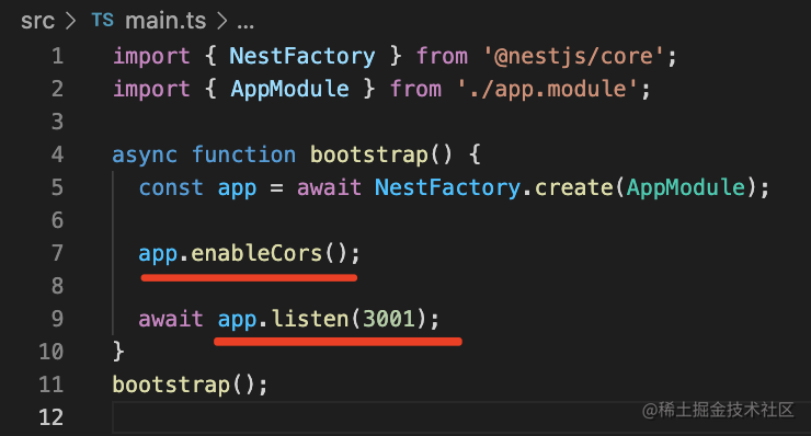 在 main.ts 启用跨域,并且修改下端口号(因为前端项目开发服务也用这个端口号):