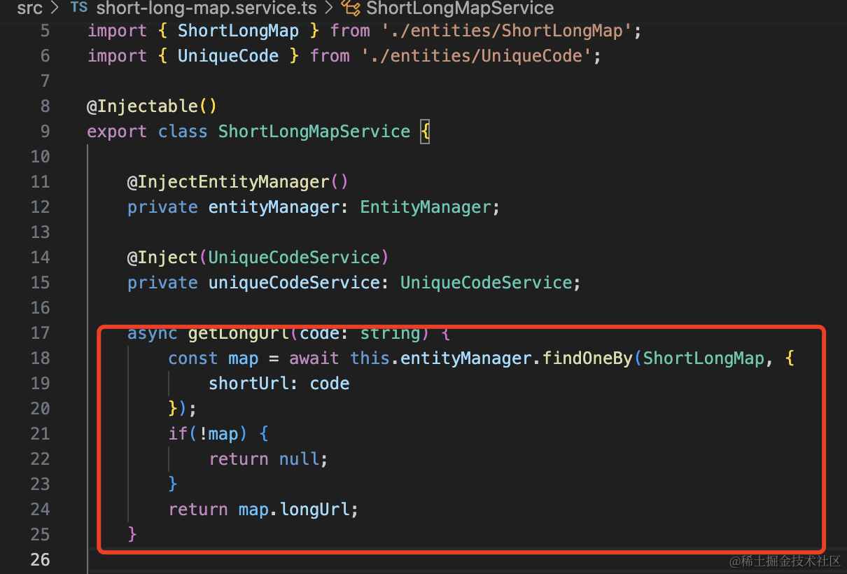 首先在 service 里添加根据压缩码查询 longUrl 的方法: