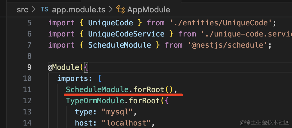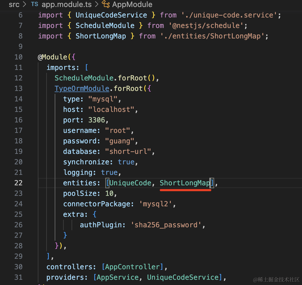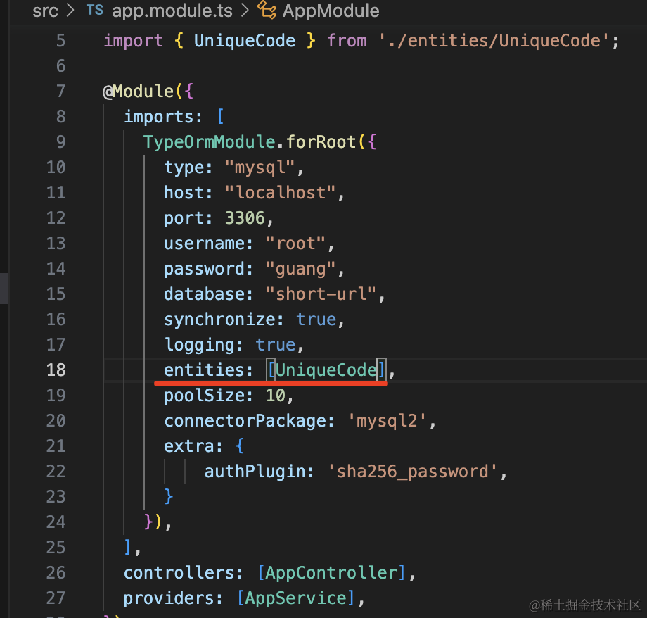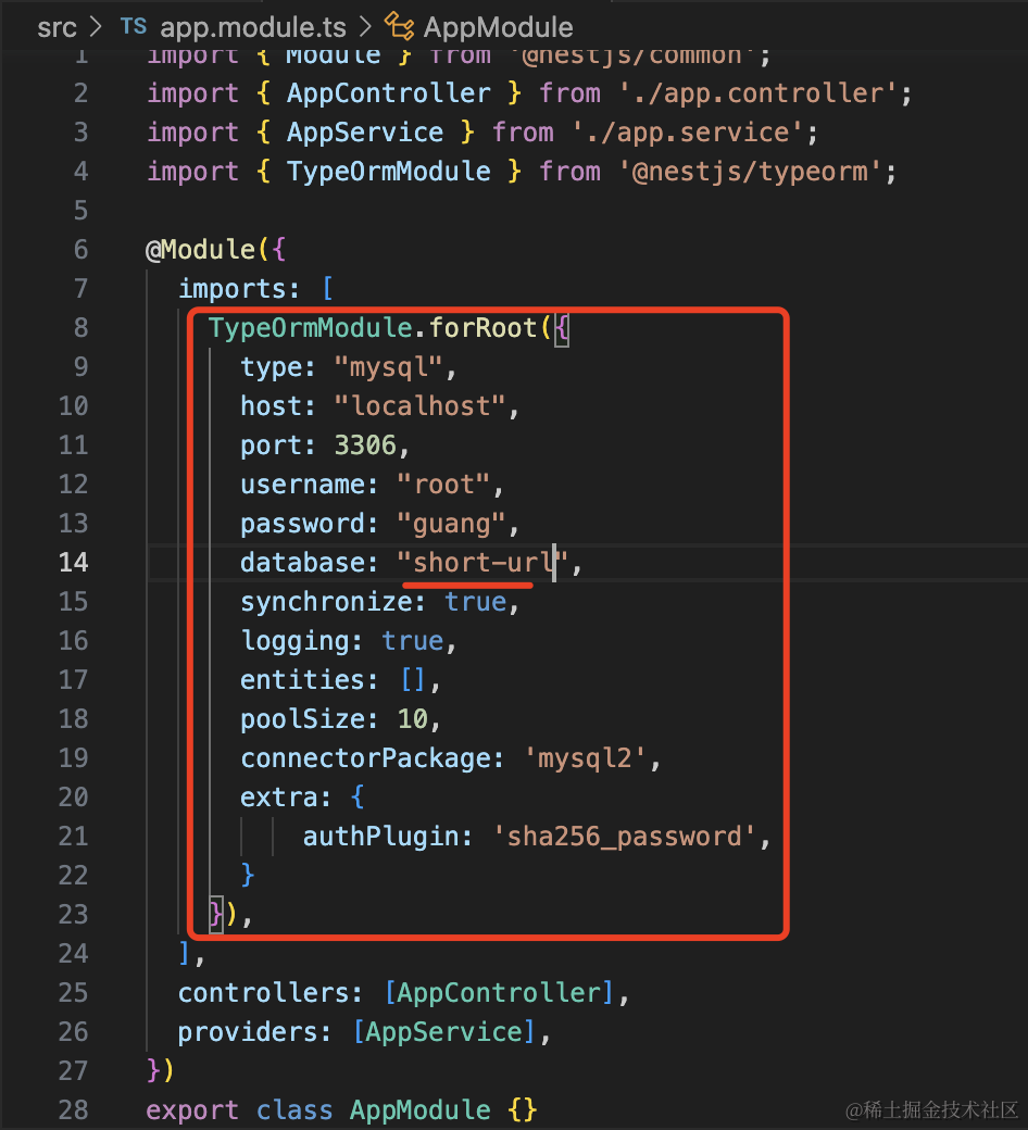在 AppModule 里引入 TypeORM,指定数据库连接配置:
