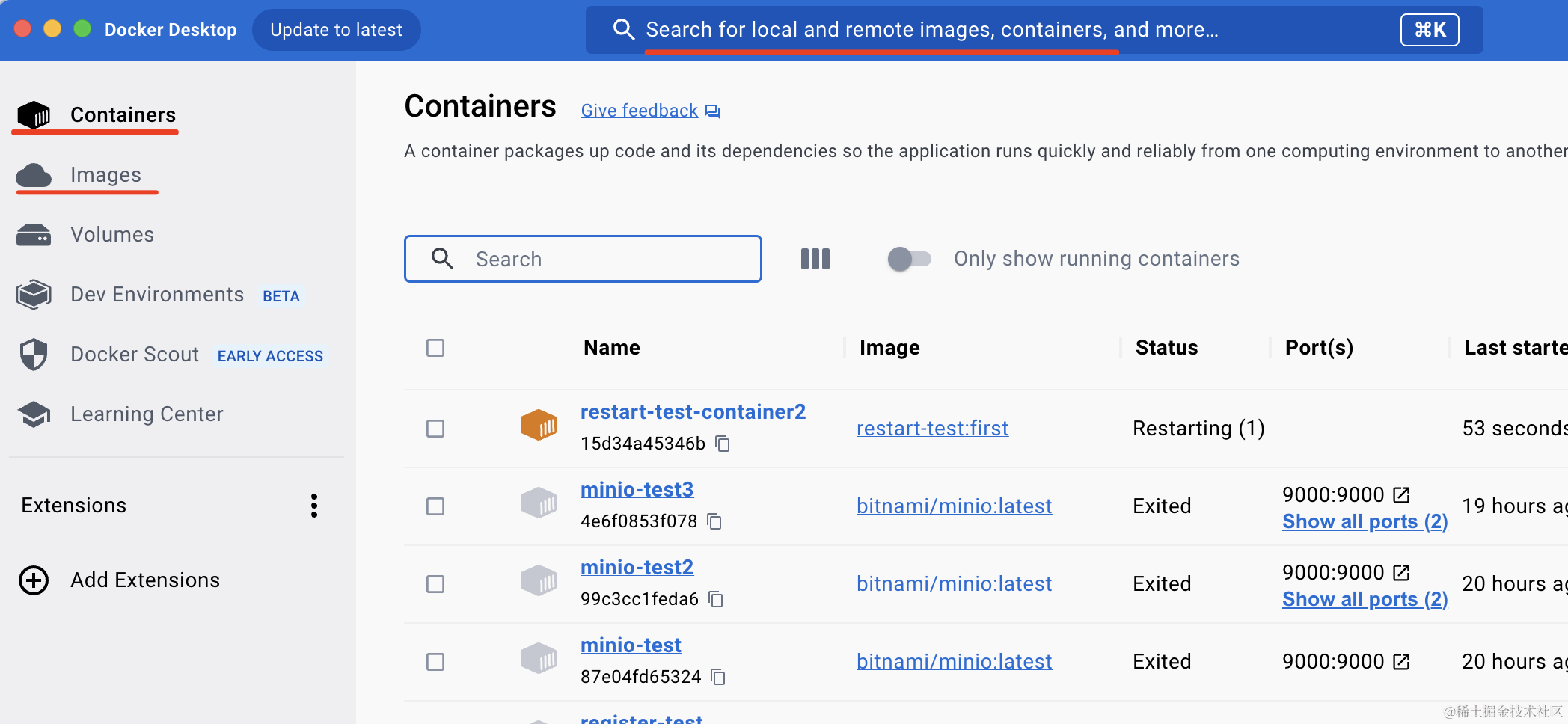 打开后可以看到本地的所有镜像和容器: