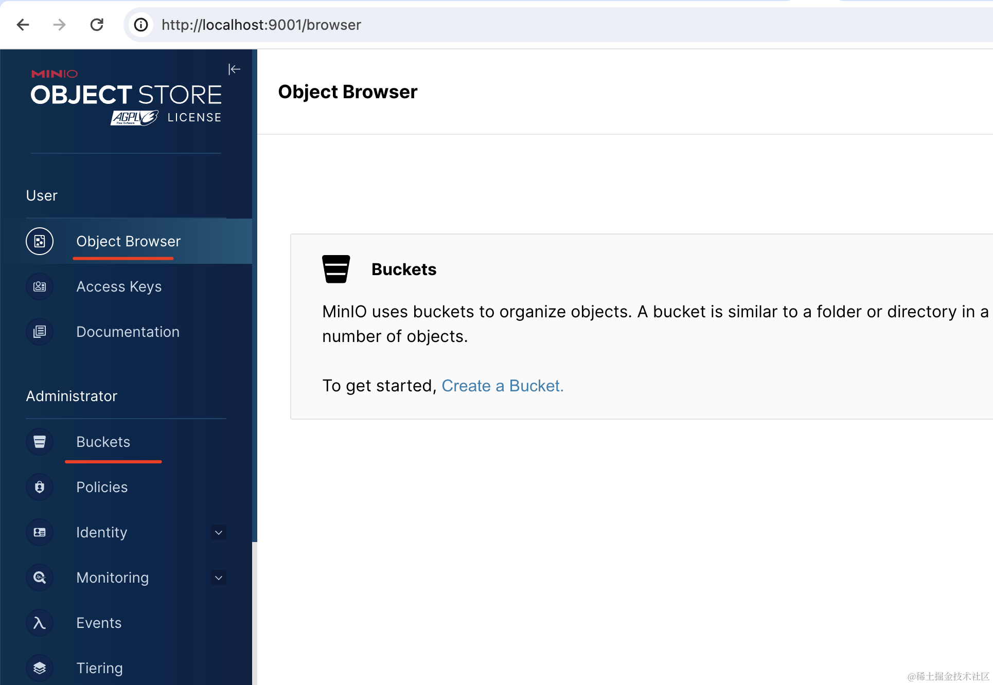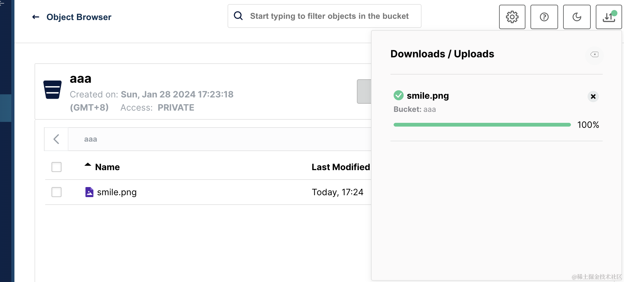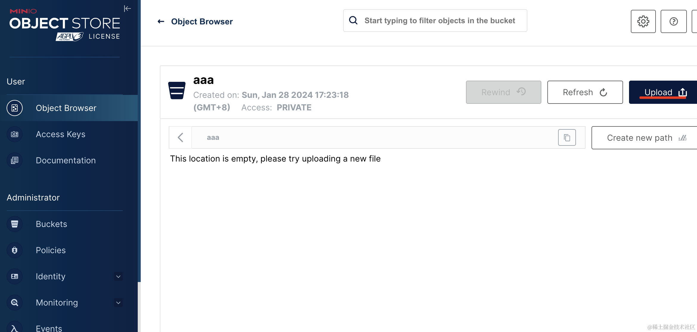 这个 bucket 就是管理桶的地方,而 object browser 就是管理文件列表的地方。